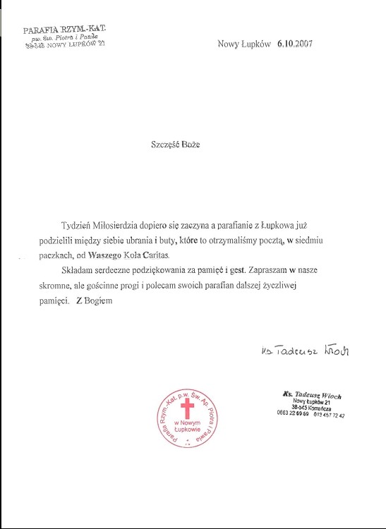 W Tygodniu Miłosierdzia wysłane zostały tam paczki z odzieżą i obuwiem. Mieszkańcy są bardzo zadowoleni i za pośrednictwem swojego proboszcza przysłali podziękowanie.