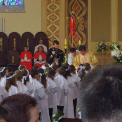Piątek (18.05) - poświęcenie pamiątek religijnych, które dzieci otrzymały z okazji Pierwszej Komunii Świętej.