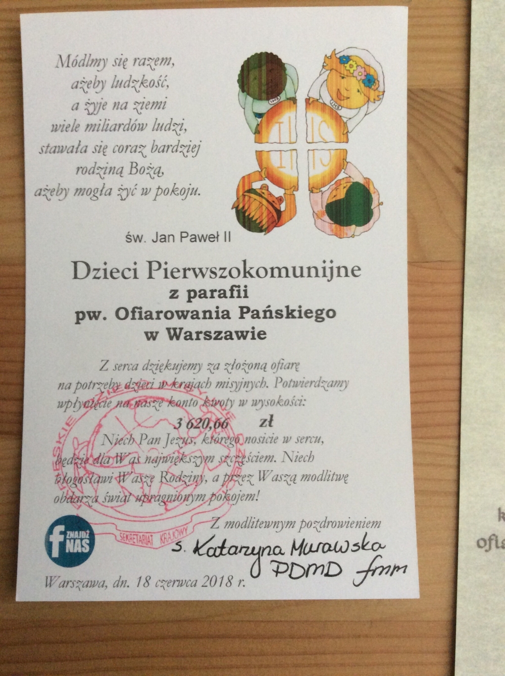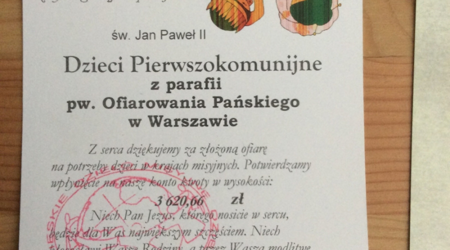Dzieci pierwszokomunijne naszej parafii i ich rodzice, wdzięczni Bogu za dar Komunii Świętej, podczas Białego Tygodnia przekazali wsparcie dzieciom z krajów misyjnych.